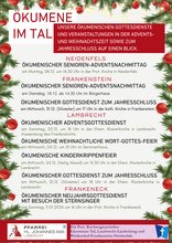 Die katholische Kirchengemeinde und die evangelische Kirchengemeinde veranstalten in der Advents- und Weihnachtszeit einige Gottesdienste zusammen. Hintergrund für diese gemeinsamen Aktionen ist die Stärkung und der Zusammenhalt der beiden christlichen Konfessionen und der Dialog, sowie das Verständnis zueinander. Mit einem gemeinsamen Flyer wird auf diese Gottesdienste hingewiesen.