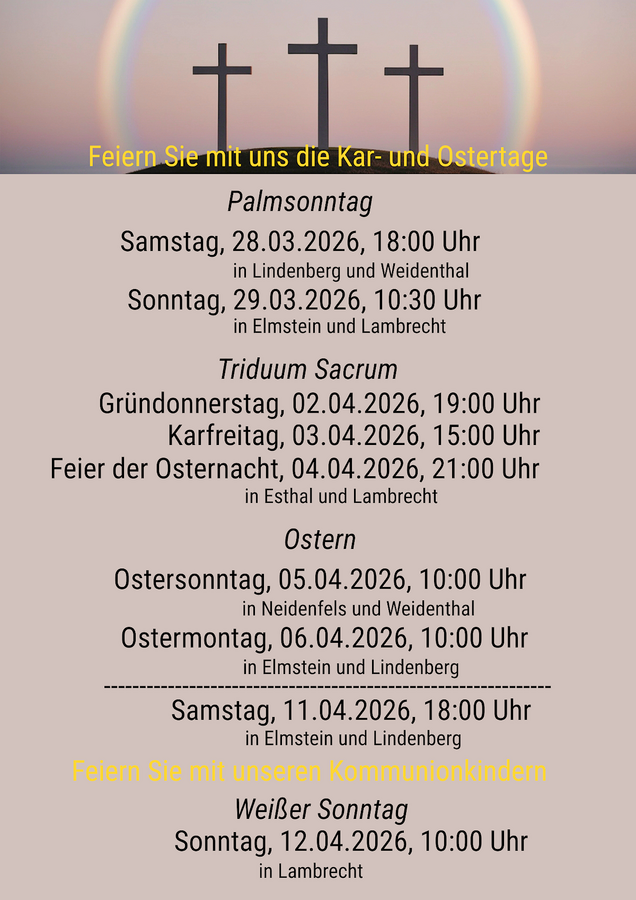 Den Auftakt bildet der Palmsonntag am 28. und 29. März mit Gottesdiensten in Lindenberg, Weidenthal, Elmstein und Lambrecht. Es folgen die zentralen Feiern des Triduum Sacrum mit der Messe vom letzten Abendmahl an Gründonnerstag (2. April), der Liturgie am Karfreitag (3. April) sowie der Feier der Osternacht am 4. April in Esthal und Lambrecht.