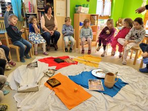 Pfarrer Herr konnte zu allen Elementen in kindgerechter Art und Weise den Kindern die Symbolen erklären und zeigen. Zum besseren Verständnis wurden die einzelnen Dinge im Kreis weitergegeben, befühlt, bestaunt und begutachtet. Passend dazu gestalteten die Kinder die Mitte des Morgenkreises mit farbigen Tüchern. Blau für das Wasser, weiß für das Taufkleid, gelb für die Kerze, orange für Chrisam Öl und rot für die Bibel. Die Kinder waren ganz bei der Sache und stellten Fragen, konnten auch zu einzelnen Elementen von eigenen Erfahrungen berichten z.B. wofür man Wasser noch verwenden kann, Teilnahme an einer Taufe, wo man noch ein weißes Kleid / Gewand trägt, für welche Ereignisse eine Kerze benötigt wird, usw. Am besten jedoch gefiel den Kindern der Duft vom Chrisam Öl auf dem Handrücken. Ein nach Zimt /Zitrone duftendes geweihtes Öl, das in der Kirche nur bei bedeutsamen Ereignissen (Taufe, Firmung, Priesterweihe) verwendet wird.