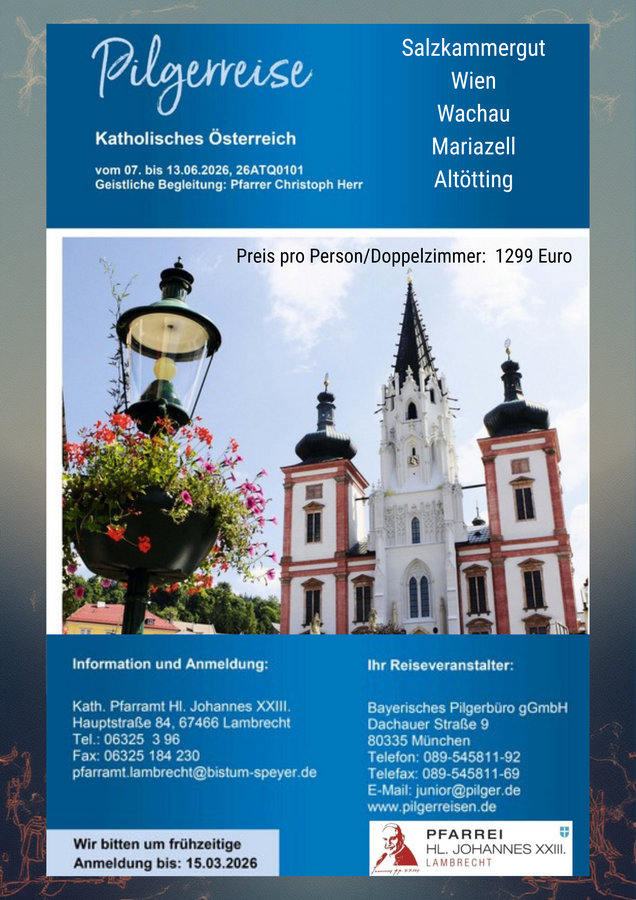 Die Katholische Pfarrei Hl. Johannes XXIII. Lambrecht lädt in diesem Jahr zu einer besonderen Pilgerreise nach Österreich und Bayern ein. Die Reise findet vom 7. bis 13. Juni 2026 statt und führt zu bedeutenden religiösen und kulturellen Orten im katholischen Österreich sowie nach Bayern.